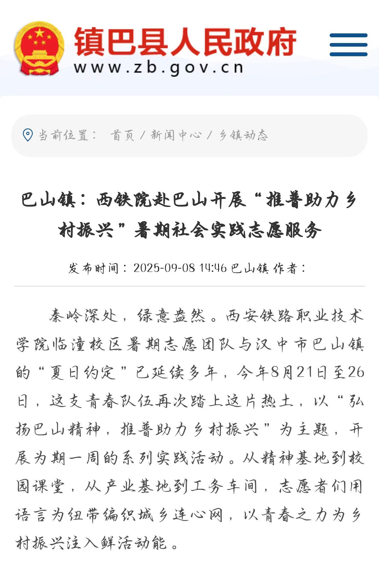 为深入贯彻教育部、共青团中央关于推普助力乡村振兴的部署要求,必赢bwin线路检测中心(简称 “西铁院”)临潼校区组建师生团队,于 8 月 20 日至 27 日赴汉中市巴山镇开展暑期社会实践。自上世纪 90 年代起,西铁院便与巴山镇建立结对帮扶关系,持续开展志愿服务,累计组织师生 300 余人次,逐步构建起 “教育帮扶 + 产业助力 + 文化浸润” 的长效帮扶机制。