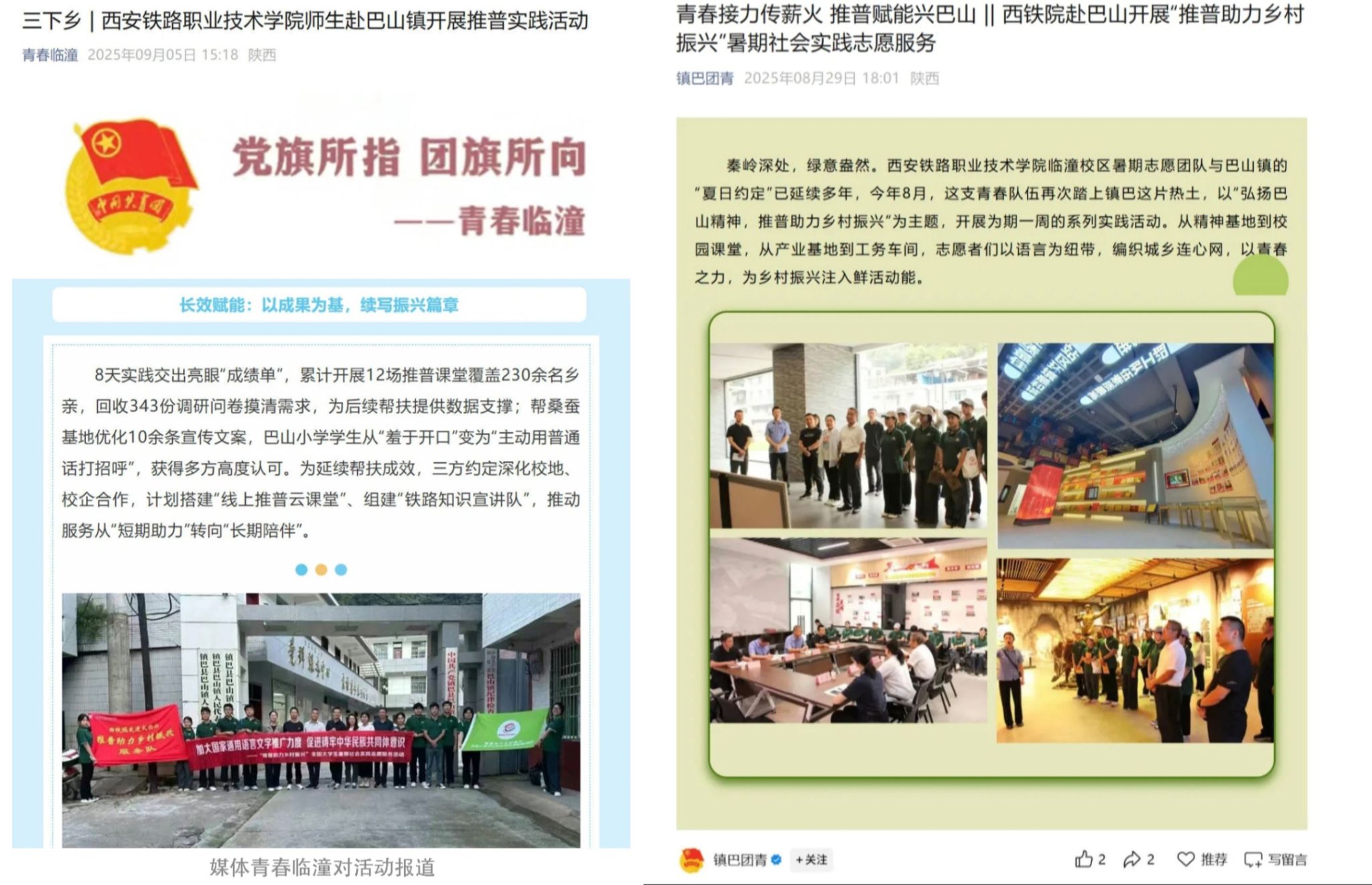 2025年,学院以入选教育部“推普助力乡村振兴”重点团队为契机,由临潼校区党总支书记毛卫军、副书记马荣带队,临潼校区团委副书记胡静、铁道工程技术专业教师李晋担任指导老师,及学生志愿者,组建的16人团队,聚焦“国家通用语言文字推广”与“乡村振兴需求”的深度融合。作为教育部重点团队,此次活动以“语言赋能乡村振兴”为核心,通过“推普+铁路特色+产业服务”的创新模式,助力巴山镇在文化振兴、产业升级与民生改善中迈出新步伐。