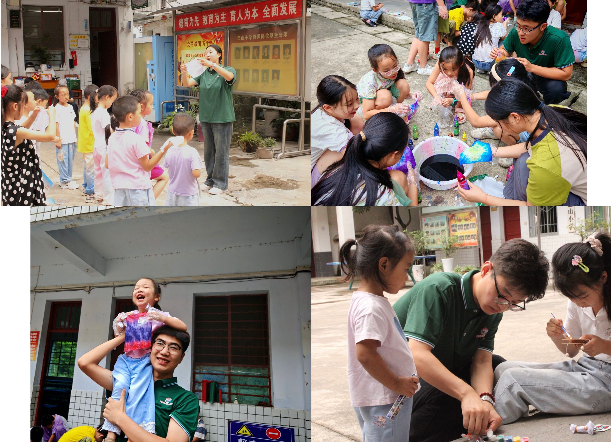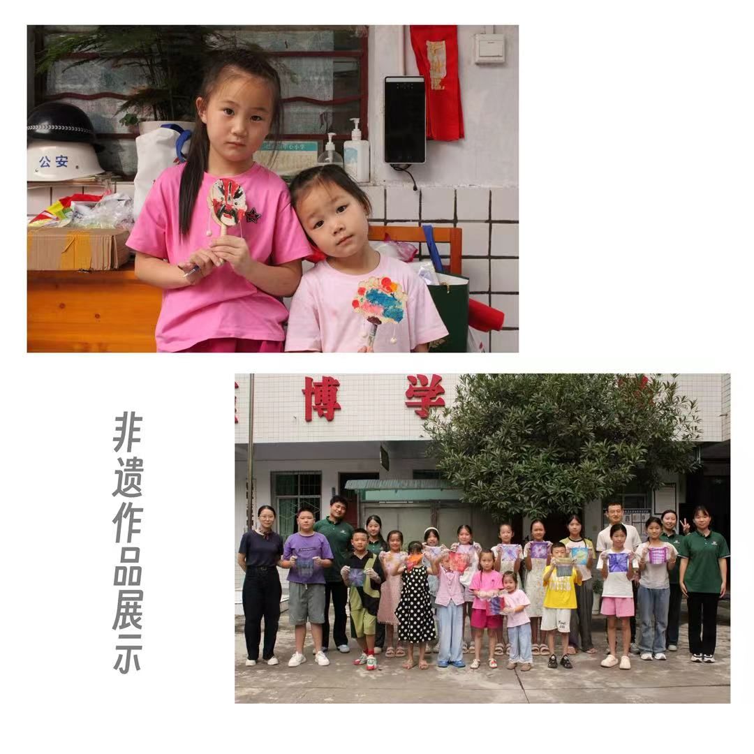 孩子们拿着扎染布料、脸谱画笔,边做边用普通话介绍:“我做的扎染像蓝天!”“我画的关羽是英雄!”
