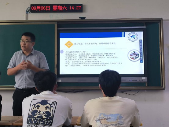 9月7日,智能制造教研室主任冯小庭、教师黄浩先后主讲“专业教学组织实施方案”与“专业发展前景”,系统介绍课程体系与就业方向。随后,同学们在专业课教师许泽伟、李永琪的带领下,参观实验实训室,近距离接触先进教学设备,深化对机械设计制造及自动化专业的认知。