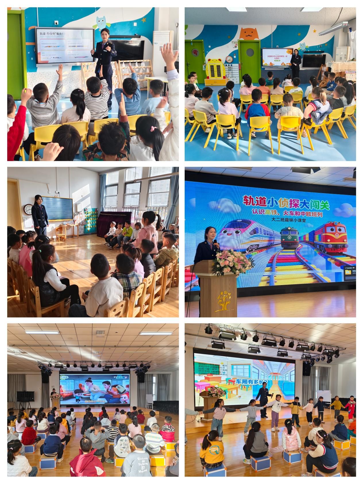 讲解学生们分组走进大班班级,迅速融入幼儿群体:有的主动帮女孩们梳理头发、扎起漂亮的小辫子,有的协助老师摆放桌椅、整理活动物资,用亲切的动作和温柔的话语拉近与孩子们的距离,课堂氛围瞬间变得温馨融洽。随之科普课堂正式开启,学生们向孩子们讲解了火车、地铁、高铁、轻轨等轨道交通的种类、基本构造与运行原理,穿插的高铁启动、地铁进站实景短视频,让孩子们直观感受轨道交通的速度与魅力。互动环节中,志愿者们化身 “轨道小老师”,通过实物道具展示、安全常识问答等形式,引导孩子们主动提问、积极思考,并奖励毽子、本子及等纪念礼品,让课堂氛围更加热烈。