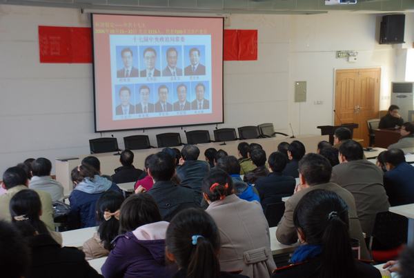 按照院党委的安排,龙首校区党总支1129日下午组织校区全体职工集中学习十八大精神。总支书记司西平就党的历次代表大会情况、十八大政治局常委、书记处书记、军事委员会、纪律委员会等机构和组织结构图,以及十八大重要精神精心制作成ppt,组织全体教职工认真学习。教职员工对这种在学习形式上的创新,给予了充分肯定。认为这样的学习,时间不长、内容丰富、声行并茂、了解全面、记忆深刻,收到了良好的效果。