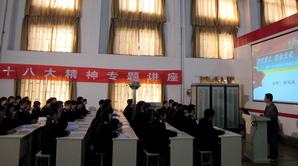 1128,院团委组织品学兼优的学生团干、学生会干部、学生社团干部、学生党员和入党积极分子等学生骨干在轨道运营实训室进行了学习十八大精神集中学习活动,学院思政教科部主任景延鹏做了辅导讲座。