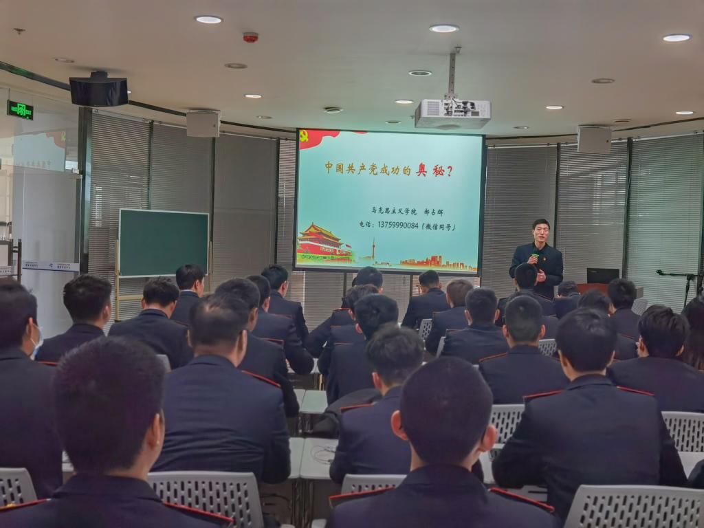 本次的“学习讲堂”由马克思主义学院郝占辉老师主讲,他以《中国共产党成功的奥秘》为主题,从科学的理论武装、坚定的理想信念、强大的组织优势、坚实的群众基础和彻底的自我革命等五个方面,为学员们生动讲述了中国共产党一百年来始终保持生机活力、始终走在时代前列、始终胸怀天下心系人民的担当和本色,揭示了中国共产党从胜利走向胜利并取得一系列伟大成就的根本原因,通过郝占辉老师的讲解,让学员们更真切的感受到中国共产党无愧于历史、人民和时代的的使命和担当。