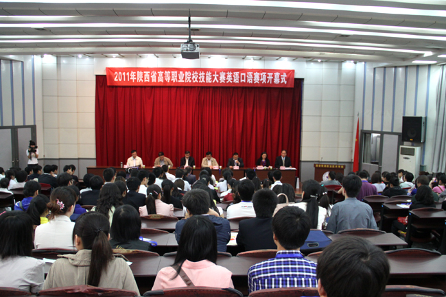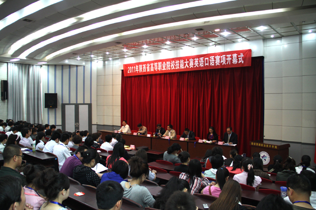 5月15日,2011年陕西省高等职业院校技能大赛英语口语赛项在必赢官网隆重举行。来自陕西省26所高职院校121名选手参加了技能大赛。省教育厅高教处处长袁宁,省教育厅副巡视员刘豫川,必赢官网院长田和平、副院长邓耀斌,教育部委派全国高职高专职业技能大赛组委会委员周龙,西安外国语大学教授潘惠霞以及各参赛院校参赛选手、评委200余人出席了开幕式。开幕式由必赢官网教务处长杨扩武同志主持。