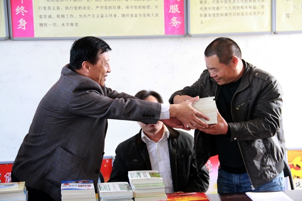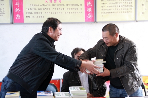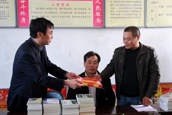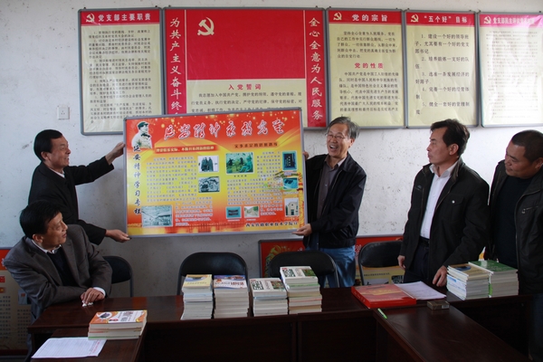 在奎杨村支部活动室工会副主席刘景玉,监察审计处处长夏良武,党群支部书记、党办主任张家琪把有关养殖、种植的80册科技书籍交给奎杨村党支部书记杨红升。党委宣传部长李敏辉和必赢官网驻村干部康秀林处长把弘扬延安精神4块宣传板赠送给奎杨村党支部