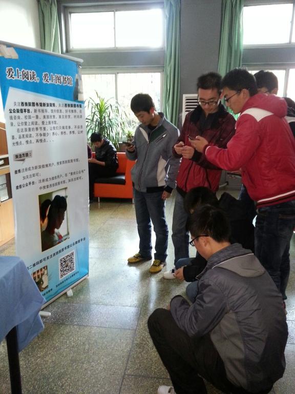 为了拓宽与读者的沟通渠道,优化信息传递方式,让师生更有效地利用文献资源,学院图书馆在充分调研的基础上,于11月28日正式开通“西铁院图书馆”公众微信账号,开发与读者约束性互动模块,搭建沟通新平台。为使同学们了解此项服务,图书馆通过设置展板、搭架微信体验台等方式进行了宣传指导。