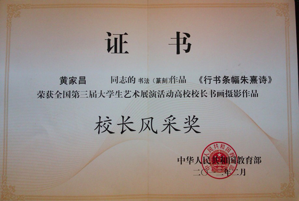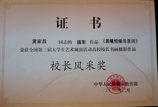 今年是必赢官网第一次参加大学生艺术展演活动,经过层层选拔评比,黄家昌的书画及摄影作品在全省20件高校校长一等奖作品中脱颖而出,经由陕西省教育厅上报全国展演活动并最终获得两项“校长风采奖”。
