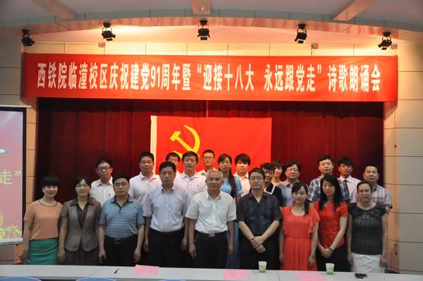临潼校区在实验楼五楼阶梯教室举办了庆祝建党91周年暨“迎接十八大  永远跟党走”诗歌朗诵会,师生代表以一场主题鲜明、内涵丰富、情感深蕴的朗诵会为建党91周年献礼,也为学院发展前进的主旋律增添了动听的音符。选手们朗诵了《四点零八分的北京》、《母亲河畅想》、《我们不会忘记》、《我的南方和北方》、《苍穹下的唐古拉》和《喊故乡》等十一首经典红色诗歌,赢得了师生们阵阵掌声。