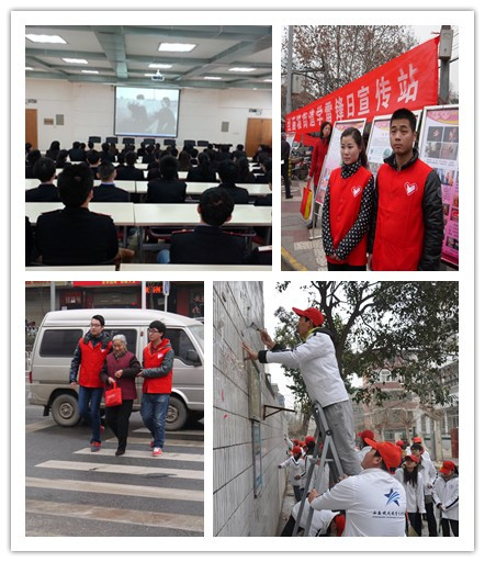 院本部大学生志愿者在北关十字和纸坊村十字开展了“维护交通秩序”、“文明跟我排”活动;与红庙坡地区其它单位走上街头联合进行家电维修、医疗服务等志愿活动;在校内对教学楼、办公楼卫生死角进行打扫、清理了学院周边小广告;龙首校区通过校园广播向学生讲述雷锋故事,播放雷锋歌曲,组织学生观看电影《雷锋》,对校区教学楼、办公楼、橱窗、校园、墙壁进行打扫;临潼校区的志愿者充分发扬了“不怕脏、不怕累”的精神,对校区图书室、实验室等地进行了清扫,使得整个校区内焕然一新。