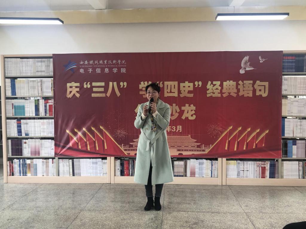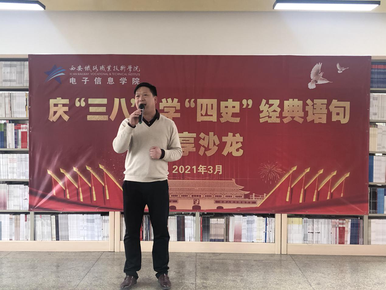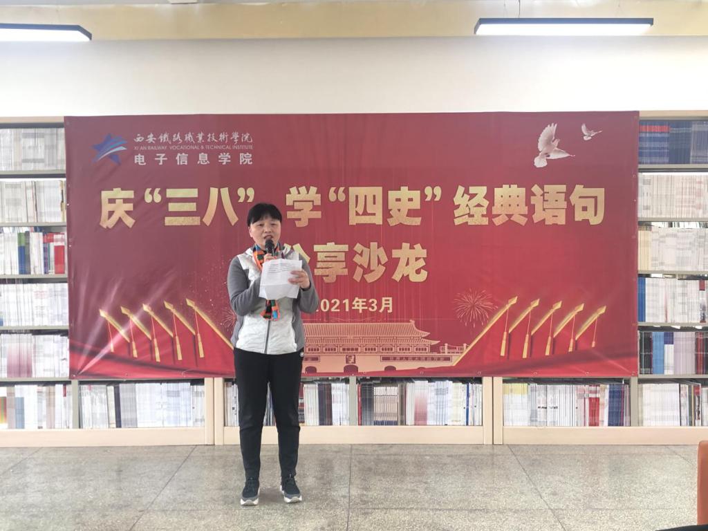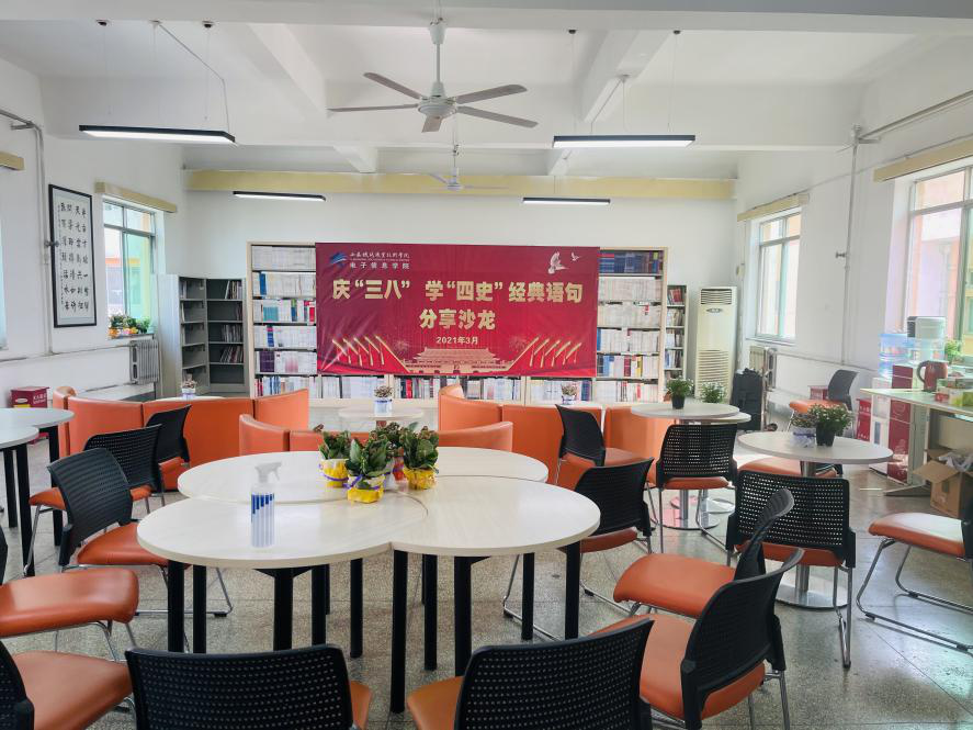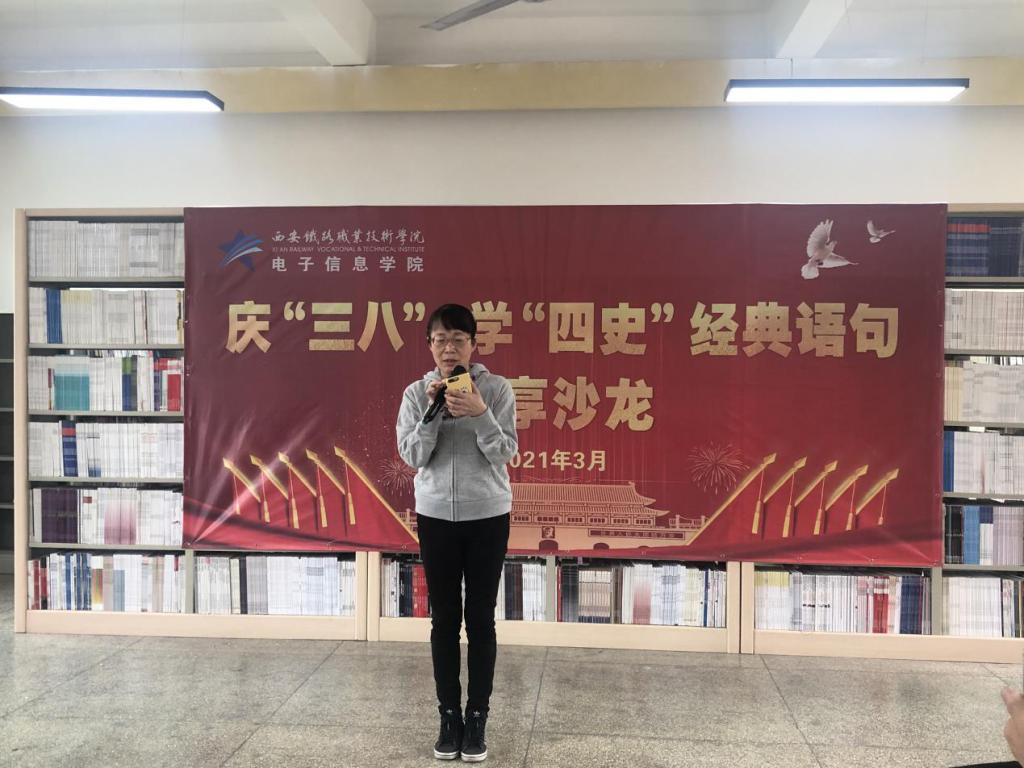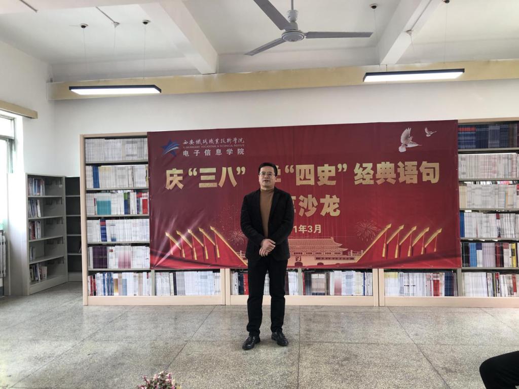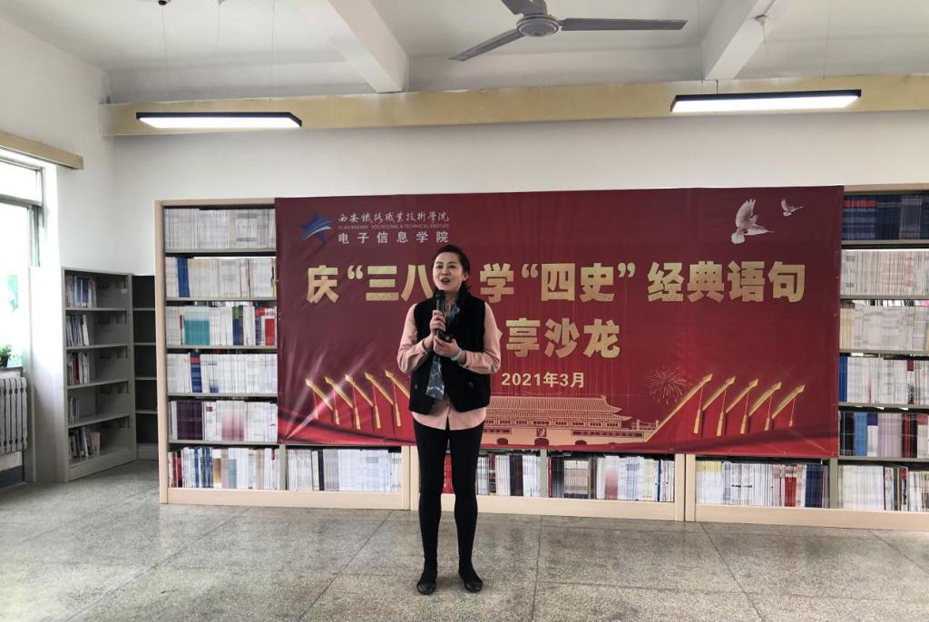 今年是第111个国际“三八”妇女节,3月5日下午,电子信息学院分会组织开展的庆“三八”、学“四史”经典语句分享沙龙活动在自强校区图书馆顺利举行,此活动是学院为庆祝中国共产党成立100周年,结合学校开展网上重走长征,推进“四史”学习教育活动而组织开展的一次主题活动。院工会副主席同颖葵、继教院副院长许晓华、自强管理处副处长马建平、电子信息学院党总支书记张伟敏、院长董奇、副院长冯国良与自强校区各职能处室、各教研室女教工等70余人参与了此次分享会。