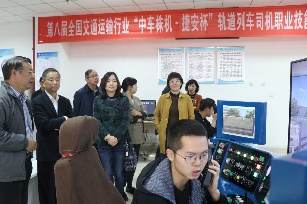 在李益民带领下,合肥地铁公司领导一行分别参观了牵引动力学院实训中心的SS4B和SS8型机车模拟驾驶实训室、机车车钩自检自修实训室、CCB-II型电空制动机实训室、机车乘务员一次乘务作业实训室、CRH380AL动车组模拟驾驶实训室、城轨车辆模拟驾驶实训室、城轨车辆电器实训室、城轨车辆牵引与制动实训室、城轨车辆电路板检测实训室、城轨车辆转向架实训室等,观摩了必赢官网学生进行的地铁模拟驾驶演示,同时城轨车辆教研室主任郝湘路还就必赢官网日前刚顺利验收的2018年重点建设项目“城轨车辆检查作业仿真演练系统”部分功能进行了展示。
