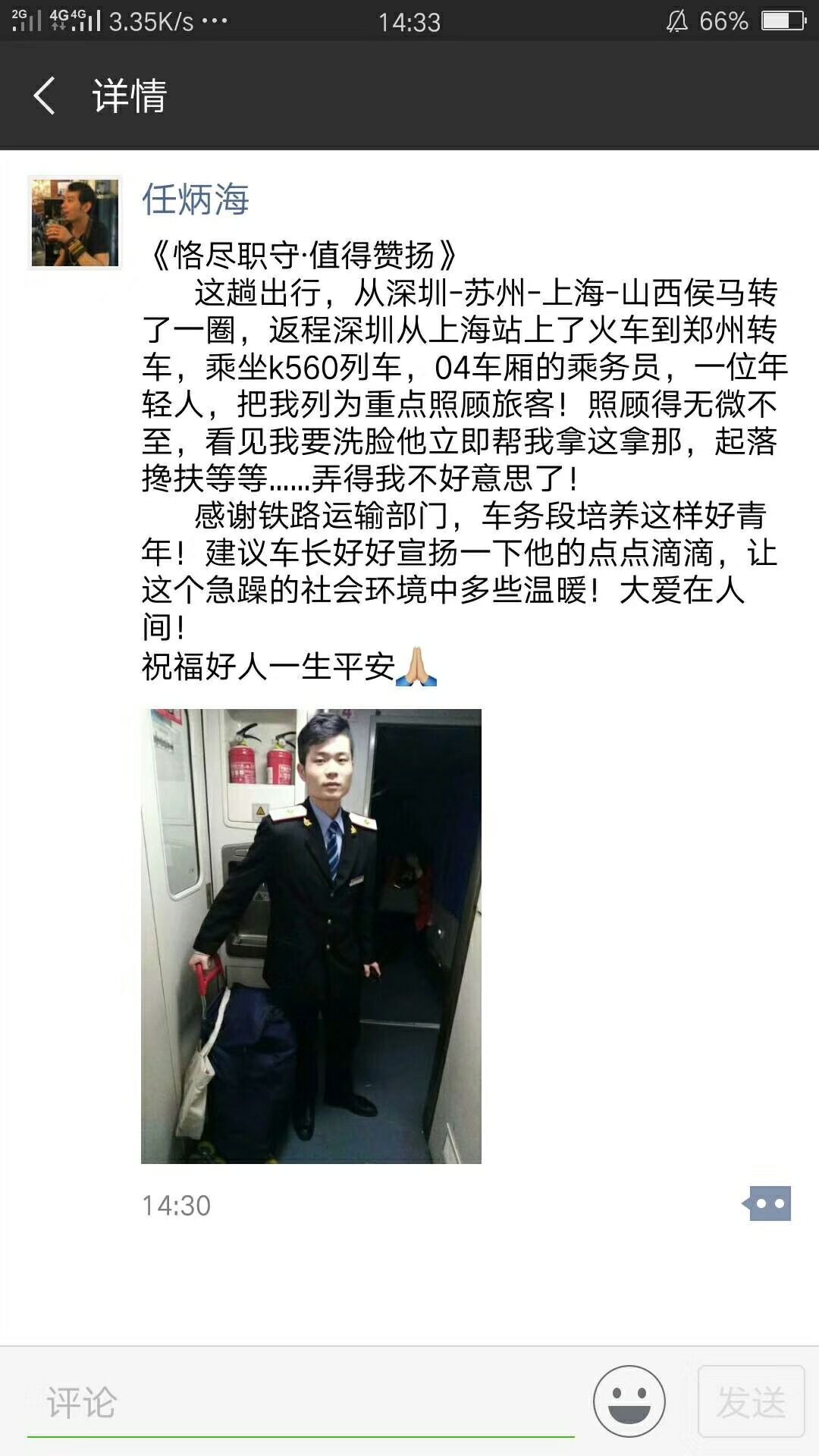 10月2日,旅客任炳海在上海至延安K560的列车上,04车厢乘务员——必赢官网牵引动力学院动车驾驶161班毕业生实习生张昕帮忙给旅客拿行李、搀扶其上厕所等,照顾的无微不至。任炳海身有残疾,因5年前动过脑部手术,四肢不便,吐字不清。虽然这是个徽不足道的关怀,却让旅客满怀感激。
