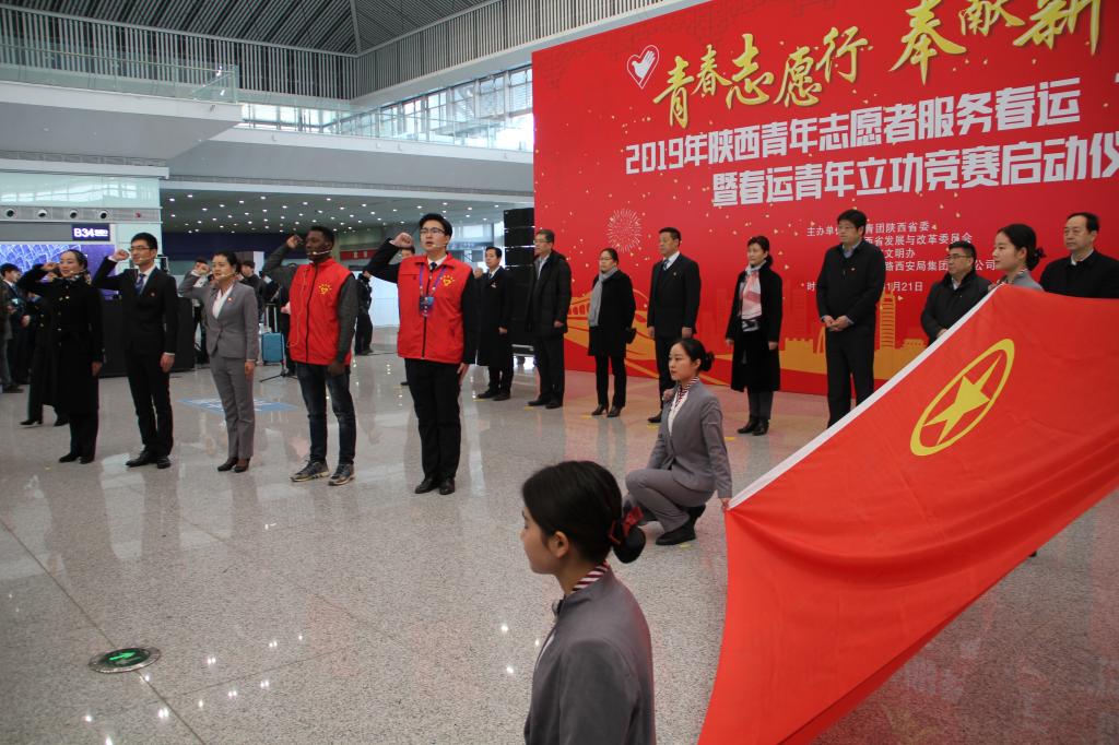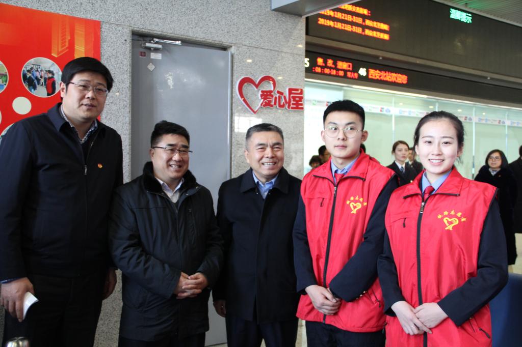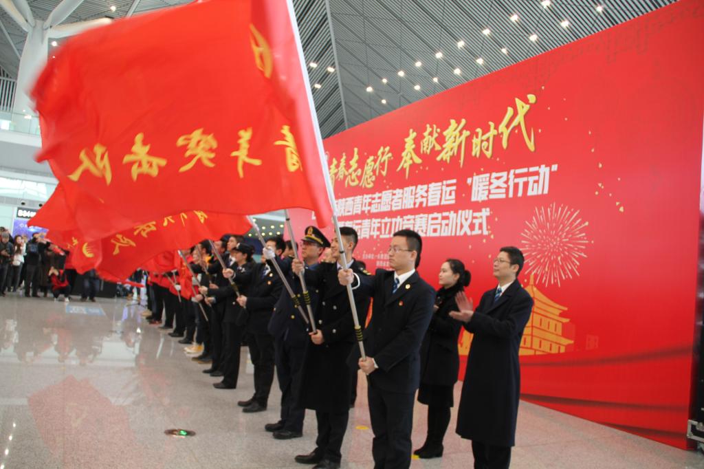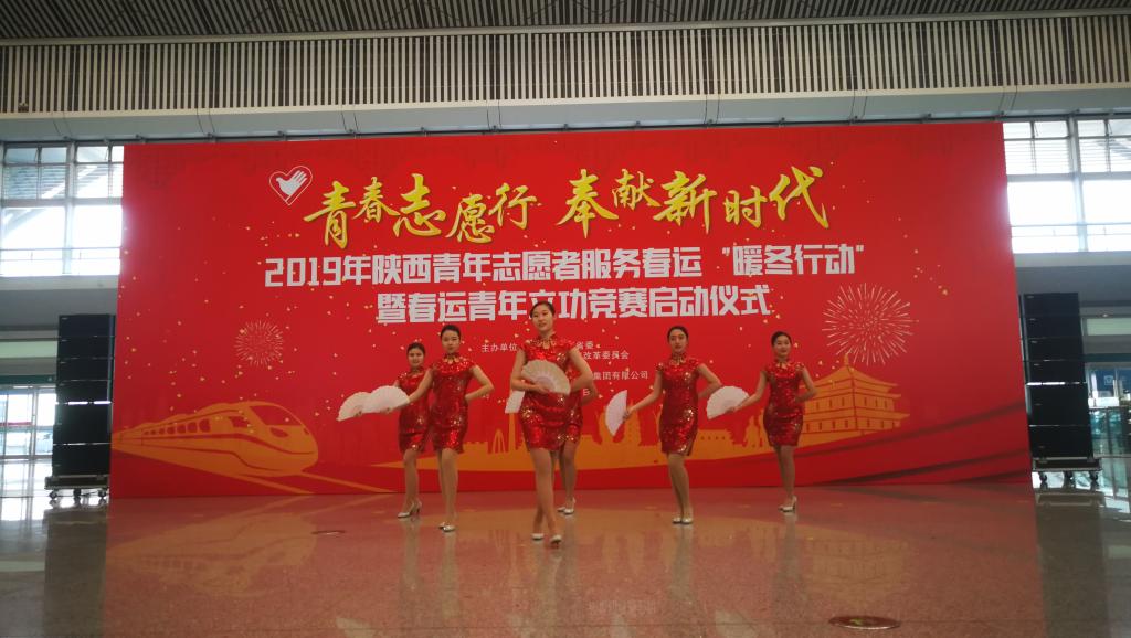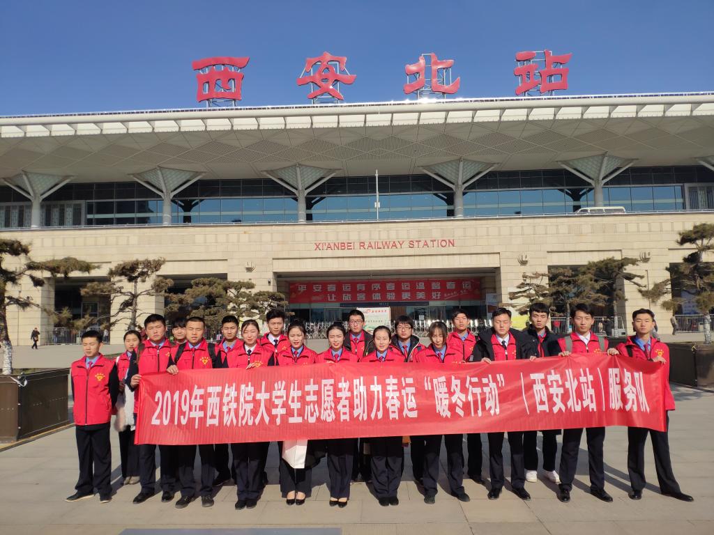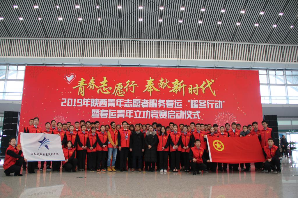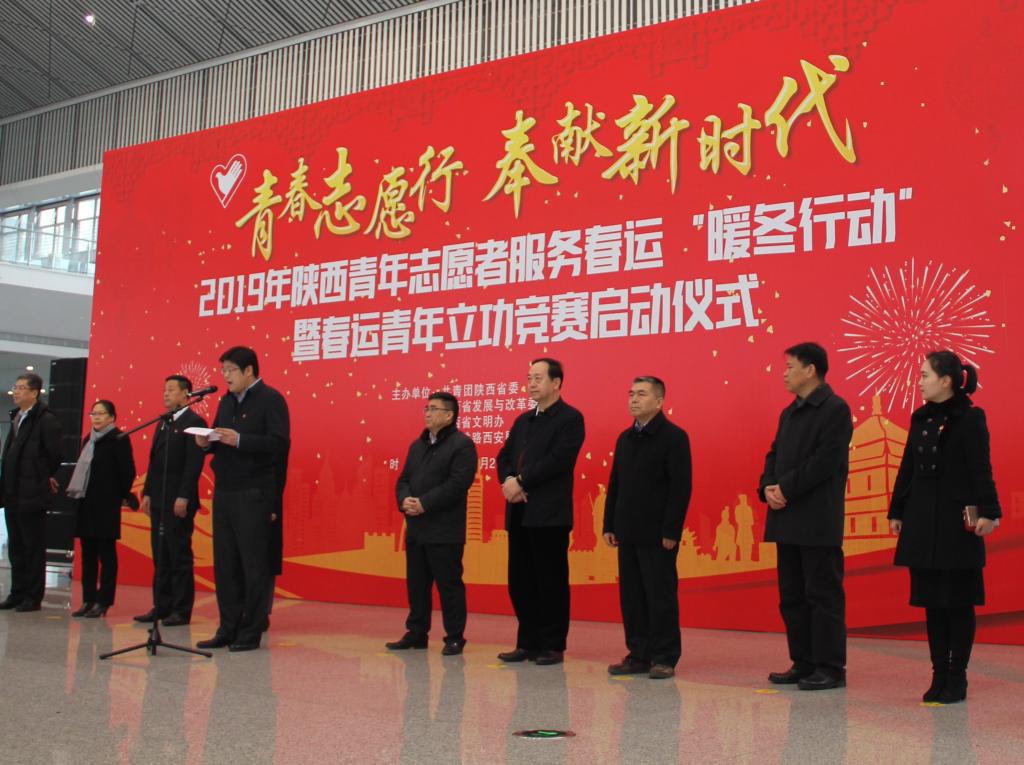 1月21日上午,由共青团陕西省委、省发改委、省文明办、中国铁路西安局集团有限公司等单位共同举办的“2019年陕西青年志愿者服务春运‘暖冬行动’”暨春运青年立功竞赛启动仪式在西安北站二楼候车大厅隆重举行。共青团陕西省委副书记、党组成员鲁镇,中国铁路西安局集团有限公司党委副书记、副董事长杨修昌,必赢官网党委副书记、纪委书记黄家昌,西安地铁有限公司团委书记李铁军等来自高校、地铁、公路、机场等系统的相关领导及300名青年志愿者代表出席了启动仪式。必赢官网团委副书记张治平、团委老师与必赢官网参与此次“暖冬行动”的四支队伍——西安北站服务队、西安站服务队、汉中站服务队和西安地铁服务队的共160余名春运志愿者参加了此次活动。