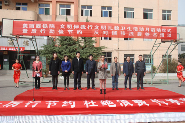 3月6日下午,龙首校区全体学生举行了“美丽西铁院 文明伴我行文明礼貌卫生活动月启动仪式暨厉行勤俭节约反对铺张浪费”的签名活动。校区主任吴领合、党总支书记郭小莉、副主任孙明魁、马建萍、学院思政部主任景延鹏、学院继续教育学院院长司西平、副院长许晓华、学工办主任高阿联和全体辅导员班主任参加了活动。活动由校区团委书记李妮主持。