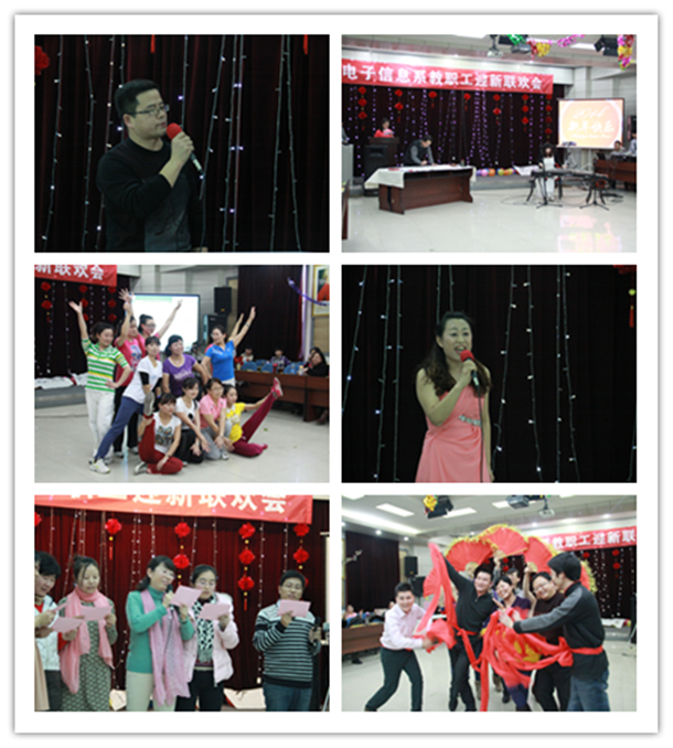 联欢会在电子信息系主任孙津平、党总支书记张伟敏、系办主任马荣、学工办主任韩发强幽默的三句半中拉开了帷幕,平易近人的语言既总结了我系2013年的成绩,也提出了对2014年的美好憧憬。紧接着电子信息系女教职工带来的快乐健美操展现了大家热爱生活,快乐运动的生活态度;充满动感的健美操后古筝与书法的默契配合又将大家引领到静谧的高山流水意境中;歌曲《好运来》、《海阔天空》、《祝福》、《亲密爱人》在展现了各位老师风采的同时也为大家送上新年的祝福;舞蹈《情系撒哈拉》,配音《大宅门》,京剧《沙家浜》、《智取威虎山》选段等一批优秀节目的表演赢得了全体观众雷鸣般的掌声。高铁教研室的情歌对唱加配舞的《圪梁梁》得到了观众们热烈的反响,电子教研室的诗歌朗诵《回家》充满了温暖与感动,城轨教研室的歌曲串烧蕴含的充沛情感带动全场一起跟着合唱,将联欢会推向了高潮。
