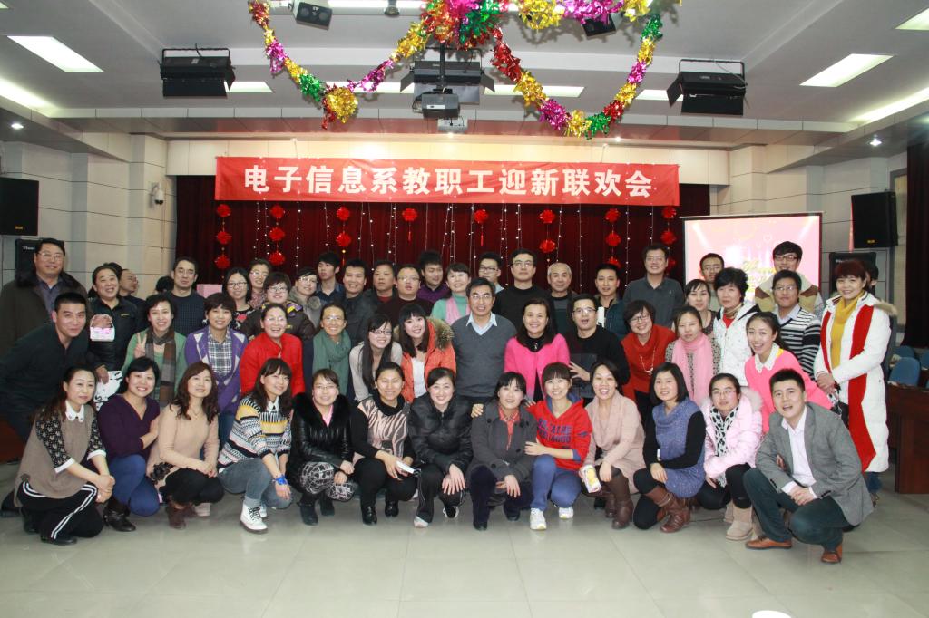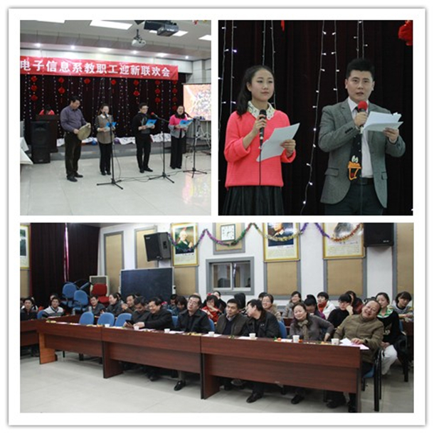 为了迎接充满希望的2014年,展现电子信息系教职工风采,1月8日,电子信息系2014教职工迎新联欢会在校本部实验楼大电教隆重举行。学院院长田和平、党委副书记、纪委书记黄家昌、工会副主席同颖葵、组织部部长任治军、宣传部部长张家琪、监察审计处处长李敏辉、教务处督导室主任史艺红莅临联欢会现场,与电子信息系教职工共同庆祝新年的到来。