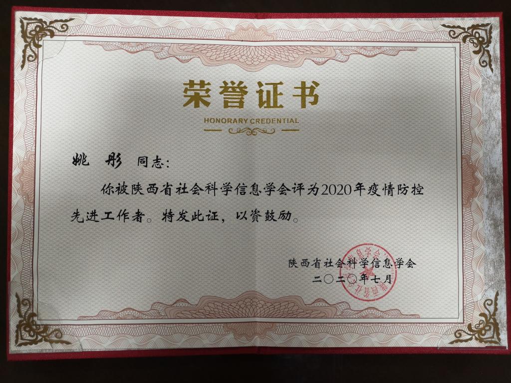 近日,陕西省社会科学信息学会召开了2020年陕西省图书情报档案学术年会。会上,对各成员馆在疫情防控工作中涌现出的先进集体和先进个人进行了表彰。必赢官网图书馆姚彤同志被评为先进个人,也是全省高职院校唯一一位获此荣誉者。
