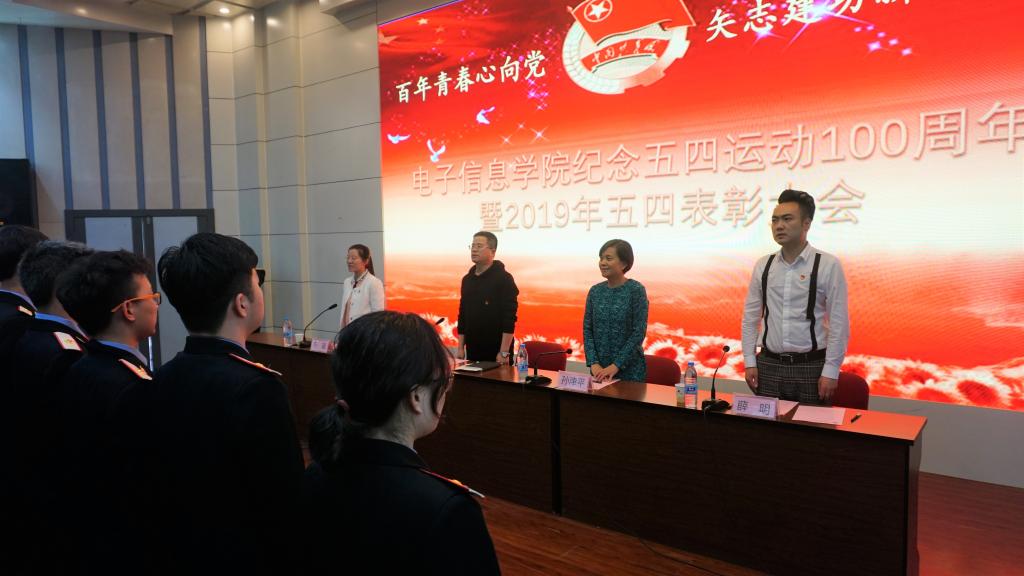 张伟敏代表电子信息学院党政工向全学院团员青年表示节日的祝贺并提出三点希望:一要做一个热爱祖国,忠于人民的新时代青年;二要做有奋斗精神,努力学习的新时代青年;三要做一个厚积薄发、本领高超的新时代青年。孙津平寄语广大团员青年 “人生最美的时刻是旭日东升,年轻人就是早晨八九点钟朝气蓬勃的太阳,要珍惜青春,不负韶华,将五四精神存心中,将爱国奋斗要牢记,中华民族美好的未来,需要大家共同创造!”