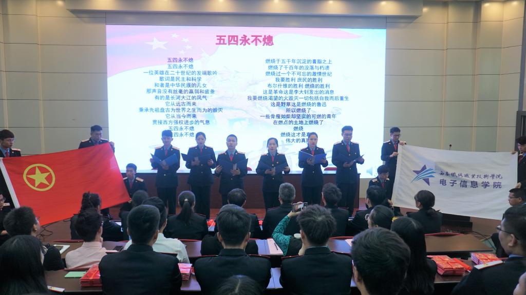接下来由朗诵社带来《五四永不熄》,句句铿锵有力的声音,带领同学们回顾了百年前那段激情燃烧的岁月,展现了电子信息学院青年学子的爱国热情,在新时代矢志艰苦奋斗,托举起伟大“中国梦”的勇气和决心。