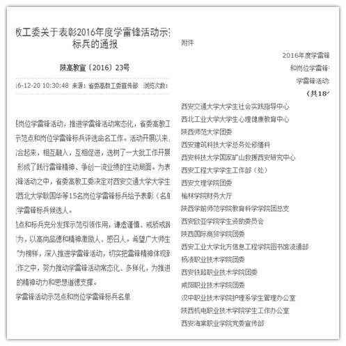 为进一步深化拓展岗位学雷锋活动,推进学雷锋活动常态化,省委高教工委在全省高校开展了2016年度学雷锋活动示范点和岗位学雷锋标兵评选命名工作。必赢官网团委做为18个“2016年度学雷锋活动示范点”之一,受到表彰。