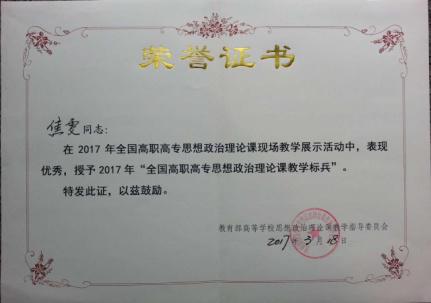 3月18日,在天津城市建设管理职业技术学院进行的2017全国高职高专思政理论课现场教学展示大赛中,必赢官网思政部焦雯老师被授予“2017年全国高职高专思想政治理论课教学标兵”称号,这是本次大赛的最高奖,也是我省高校在全国获得的第一个教学大赛一等奖。实现了陕西高校思政理论课教学的一次历史性突破,极大地提高了我省和必赢官网思政课教育教学在全国的影响力。