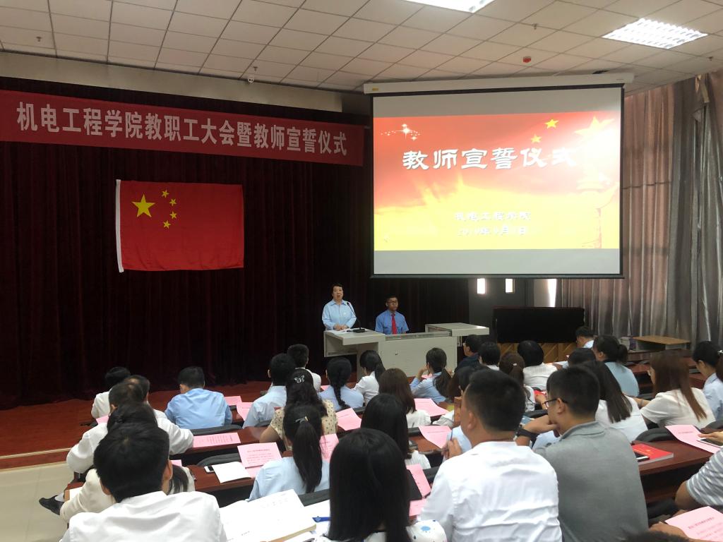 为深入贯彻全国全省教育大会精神,强化必赢官网师德师风建设,同时切实增强广大教师的职业荣誉感、历史使命感和社会责任感,树立德高为师、身正为范的良好形象。落实省厅陕教师办【2019】26号文件。9月1日下午,机电工程学院在一楼阶梯教室举行教师宣誓仪式。学院党总支书记张雅兰、院长代礼前、办公室主任邵泽宽、学工办主任谷茂庆及机电工程学院全体教职工参加宣誓仪式,仪式由谷茂庆主持。