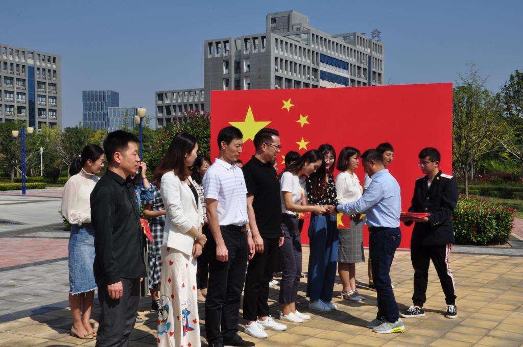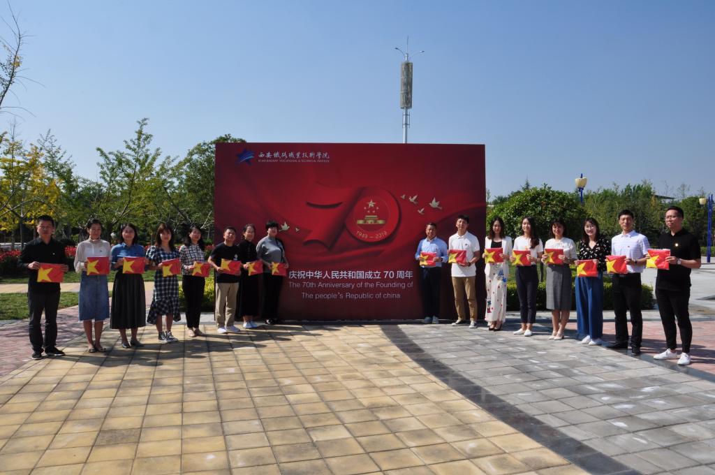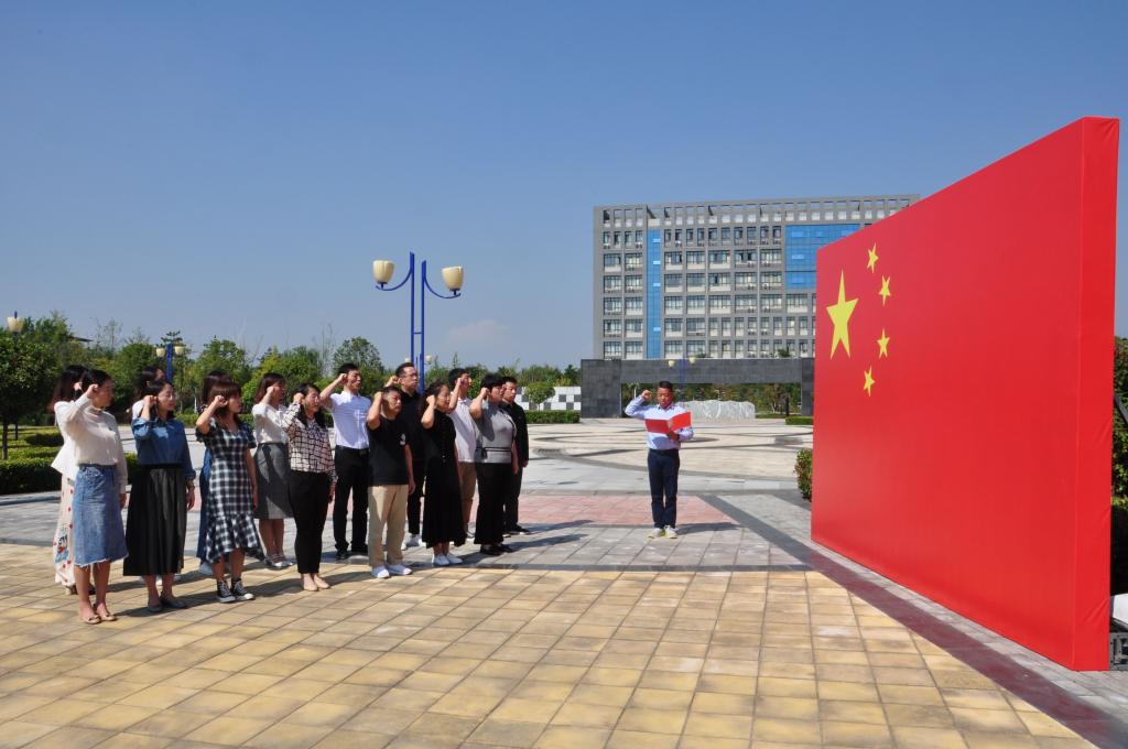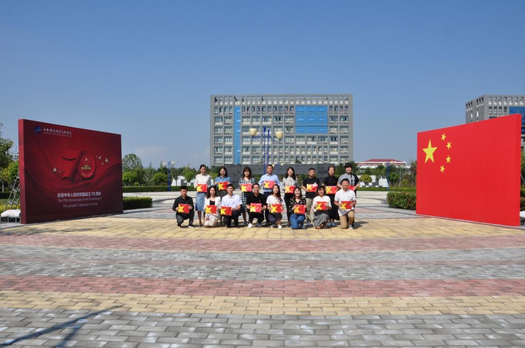 为庆祝中华人民共和国成立70周年,结合“不忘初心、牢记使命”主题教育,2019年9月25日中午,思政教科部组织了“思政教师向国庆献礼”活动,组织全体教师在喷泉广场巨幅国旗前进行了宣誓,为祖国献上生日祝福。