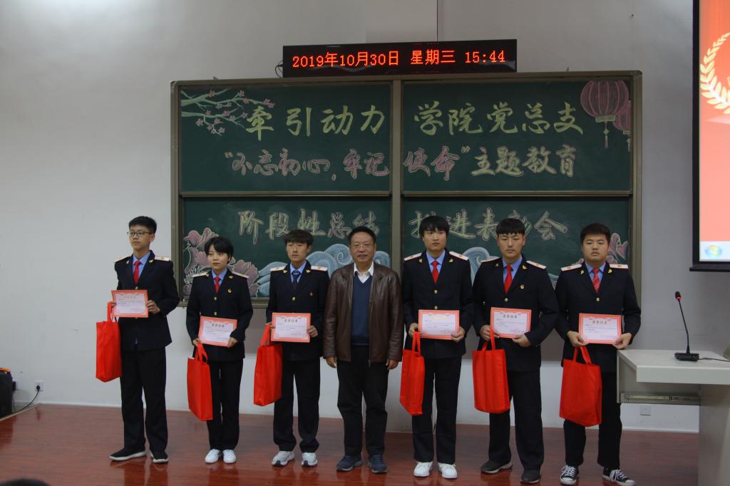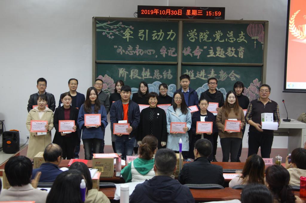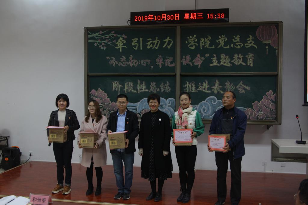 党总支宣传委员宣读了“不忘初心 牢记使命”主题教育阶段性总结推进表彰决定,党总支书记和晋秦、院长李益民分别为获得“学起来”的5个优秀组织奖、3个优秀班集体、8个先进个人,获得“唱起来”的3个先进个人、59名教职工和47名学生,获得“讲起来”的16名师生,获得“做起来”的3个优秀组织奖、21名探讨课程思政的教师、15名学生党员,5个优秀班集体、19名先进个人,37名志愿服务的师生颁发了荣誉证书和奖品,既是大张旗鼓的树立典型、鼓励先进,也是对深化主题教育奏响了最强音。