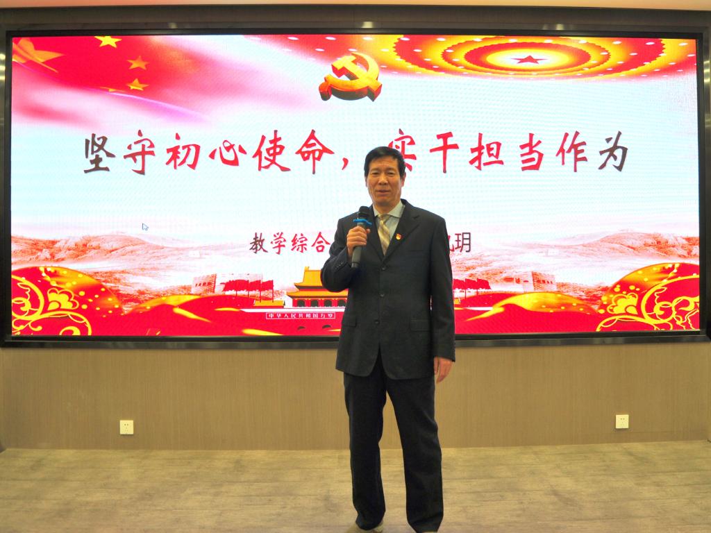 基础党支部党员王晓丽做了题为“坚守初心使命,落实立德树人”的发言,她讲述了自己如何“把思政课从有意义变成有意思”的奋斗历程。