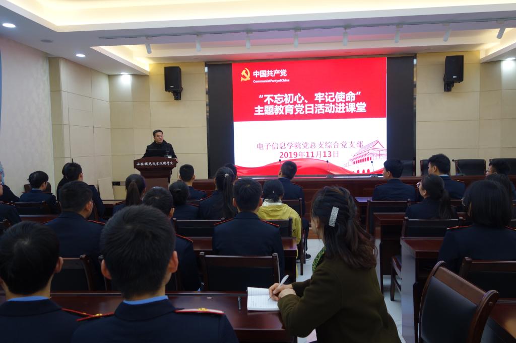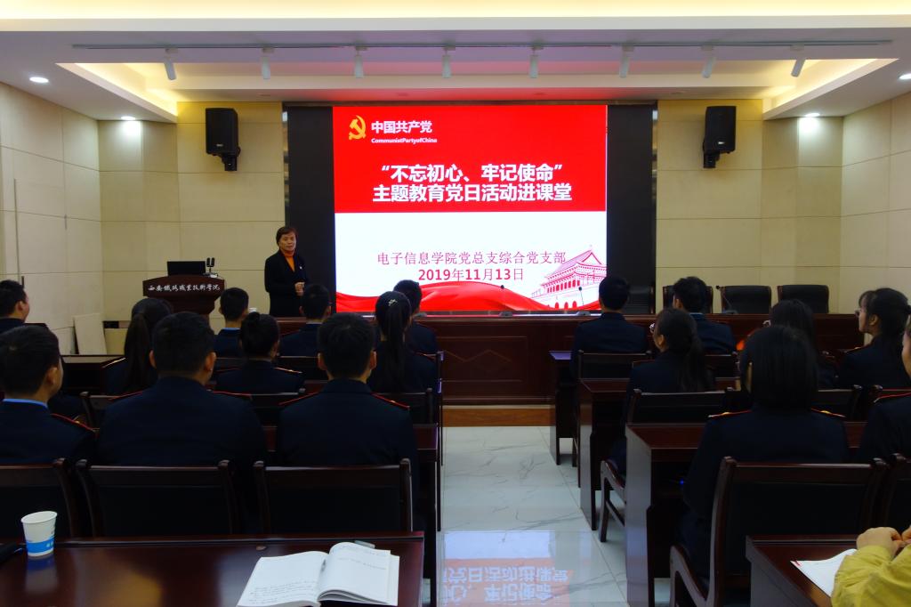 电子信息学院党总支综合党支部在主题教育中不断创新方式丰富载体,和课堂思政结合、和学生实际结合,推动主题教育走深走实。11月13日该党支部全体党员来到软件技术1801班,举办了别开生面的主题党日活动。