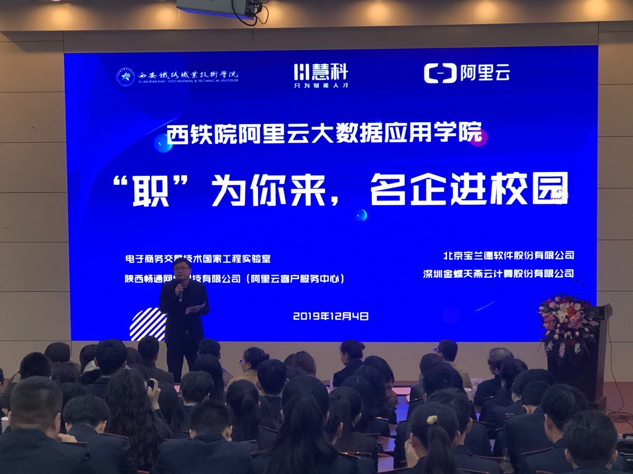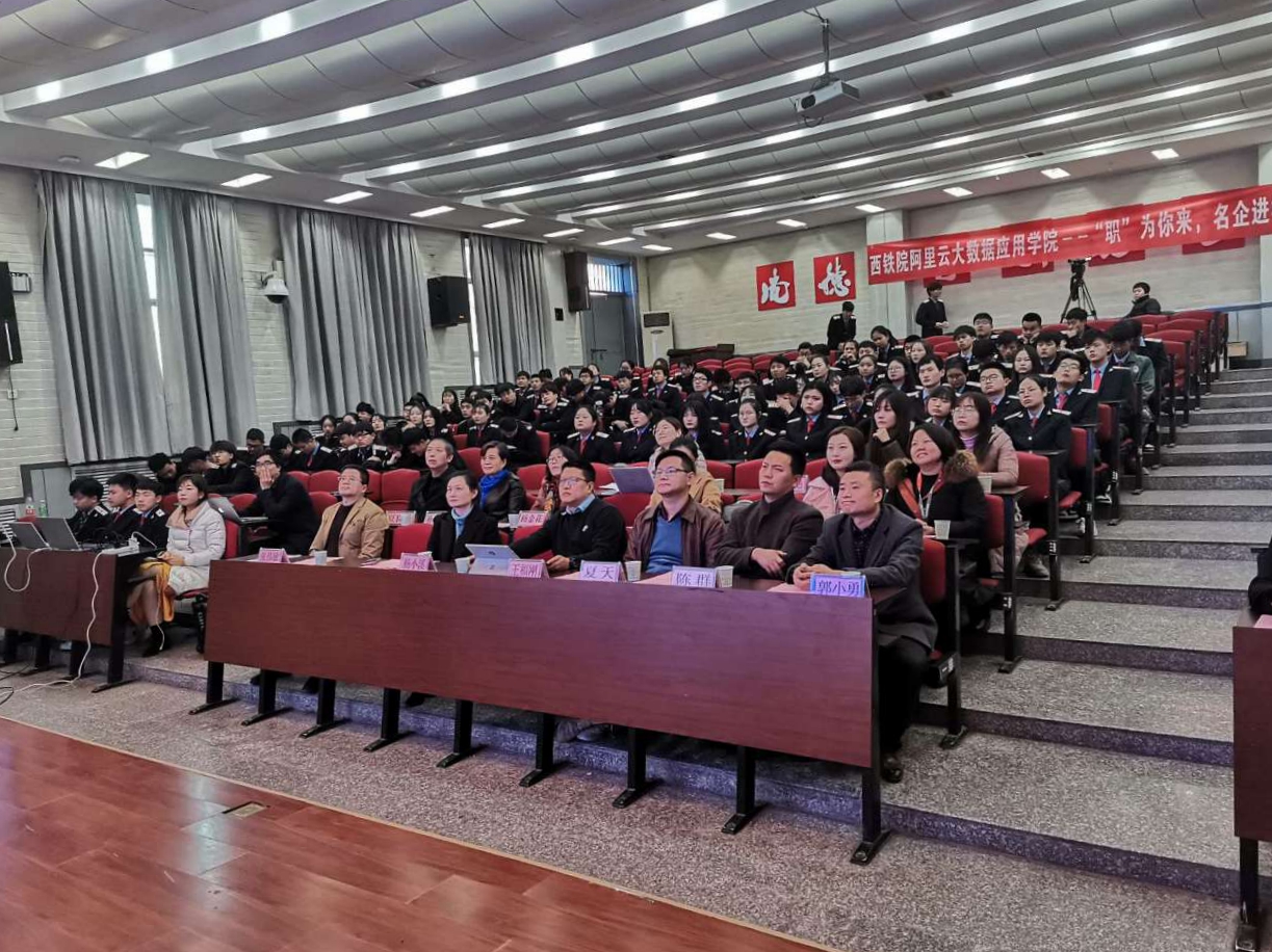 必赢官网阿里云大数据应用学院“职业起航”活动月于12月4日正式拉开帷幕,当日下午在必赢官网自强校区举行首场主题为“‘职’为你来,名企进校园”的活动。企业嘉宾,慧科教育集团代表,学院招生就业处处长夏良武、电子信息学院院长孙津平、电子信息学院党总支书记张伟敏、教师代表及大数据学院全体学生共同参与本次活动。活动由软件技术教研室主任朱金坛主持。