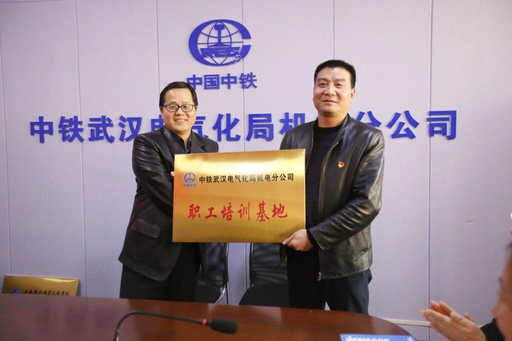 仪式上,双方签订了校企共建“产教融合实训基地”协议书。在热烈的掌声中张伟敏向中铁武汉机电分公司授“教师企业流动站”牌;耿高鹏向电子信息学院授“职工培训基地”牌。