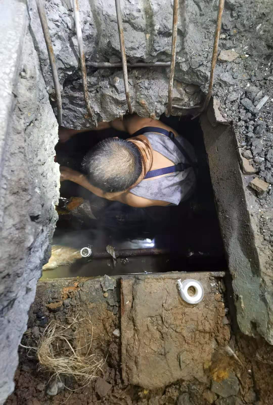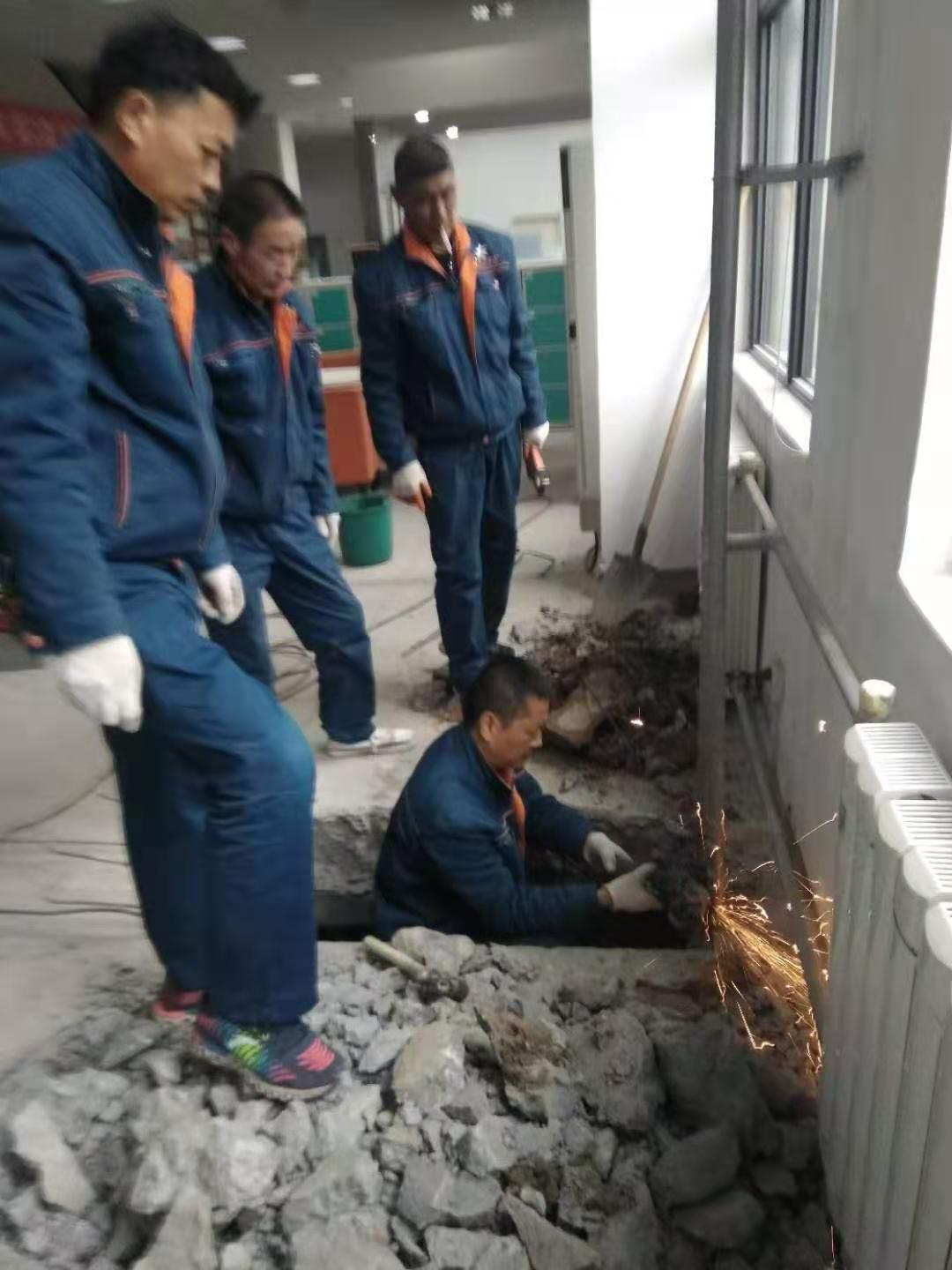 首先分区关闭供暖阀门,接着凿挖水泥地面、截断预制钢筋网片,然后钻入地沟查看分析原因,制定抢修方案。地沟之内空间狭窄,大型工具无法使用,仅容一人拿手工切割腐蚀断裂的水管,手动套丝。按照预设方案,师傅们娴熟、有序的组装、安装好了全部管件。