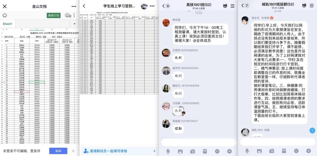 针对学生分散在家的现状,校区专门制定了《关于保障线上教学质量的通知》并下发给全体学生,要求学生实行“双签到”制度,即开课前十分钟,在班级微信群或QQ群签到,提前五分钟在学习平台内签到,做好了课前准备工作。同时,全体辅导员、班主任深入各班级群,做好课前提醒工作,建立各班级考勤签到台账,及时联系未上线学生,确保学生按时参加授课和集中辅导,积极协助授课教师做好教学组织工作。