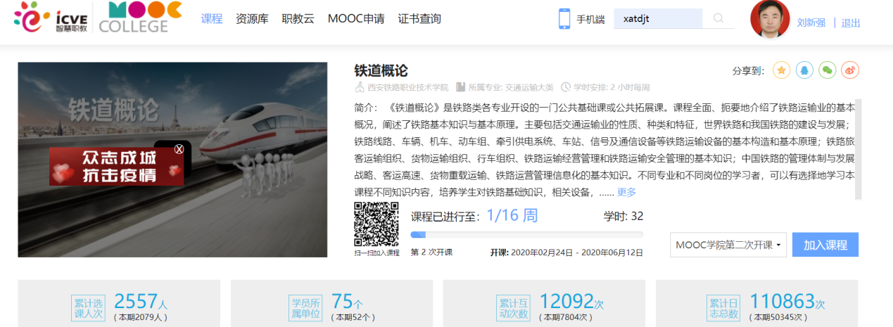 利用寒假,两门课程完善了课程信息、教学内容、在线作业、在线测验、在线考试等线上教学资源,通过了智慧职教MOOC学院的课程申请和教学内容审核,获得课程代码和课程二维码,并发布开课公告和学习指南,于2月24日向社会和学校准时开课。本期《铁道概论》注册学员2079人,服务校内35个班级,1544人,服务社会学员535人。《城市轨道交通服务礼仪》注册学员2501人,服务校内9个班,438人,服务社会学员2063人。