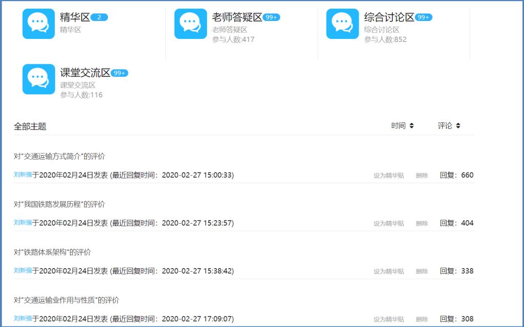 为了方便学生在线学习,交通运输学院安排了教学经验丰富的教师组成在线教学课程组,开展在线辅导和论坛答疑,实现了所有线上课程能按时开课和教学辅导。集中辅导期间,《铁道概论》校内学生上线1523人,上线率98.6%,答疑533人次,论坛交流1345次,学习热情高涨。