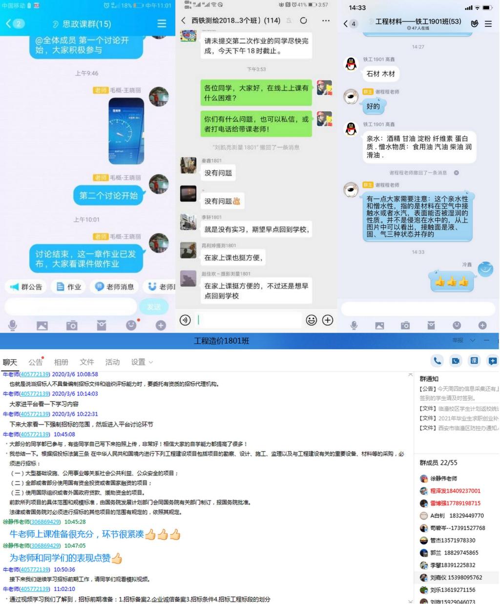 校区领导抓好“责任田”,检查教学组织工作。按照校区成立线上教学质量保障工作领导小组的责任要求,四位处级干部每人包抓约六个班级的教学督导任务,实行线上23个教学班级的全覆盖、全过程、精细化管理,通过深入QQ群、腾讯课堂等教学群,随机检查每日实时督导教师授课、学生上课和师生互动情况,确保线上教学工作各环节组织严密、规范有序。