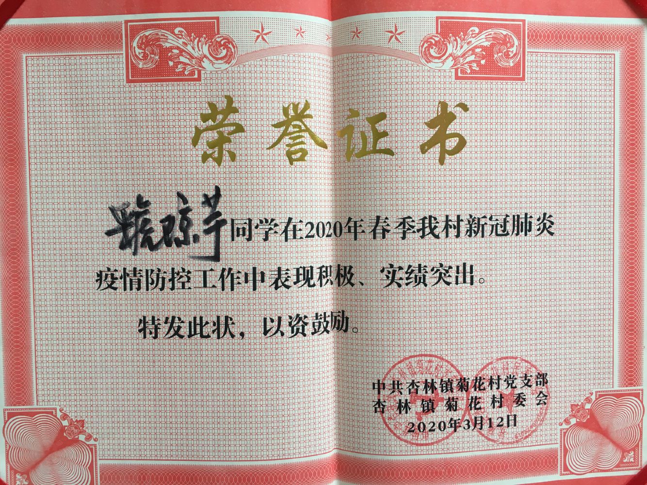虢琼芋,男,机电工程学院2020届毕业生,机电一体化1701班班长,入党积极分子。接到感谢信后,班主任通过视频对他进行了表扬,肯定了他勇挑重担的精神,虢琼芋腼腆地说:“看到村上的党员带领着大家做着防疫工作,作为一名大学生,能够参与到这场战斗中,我感到非常光荣!”