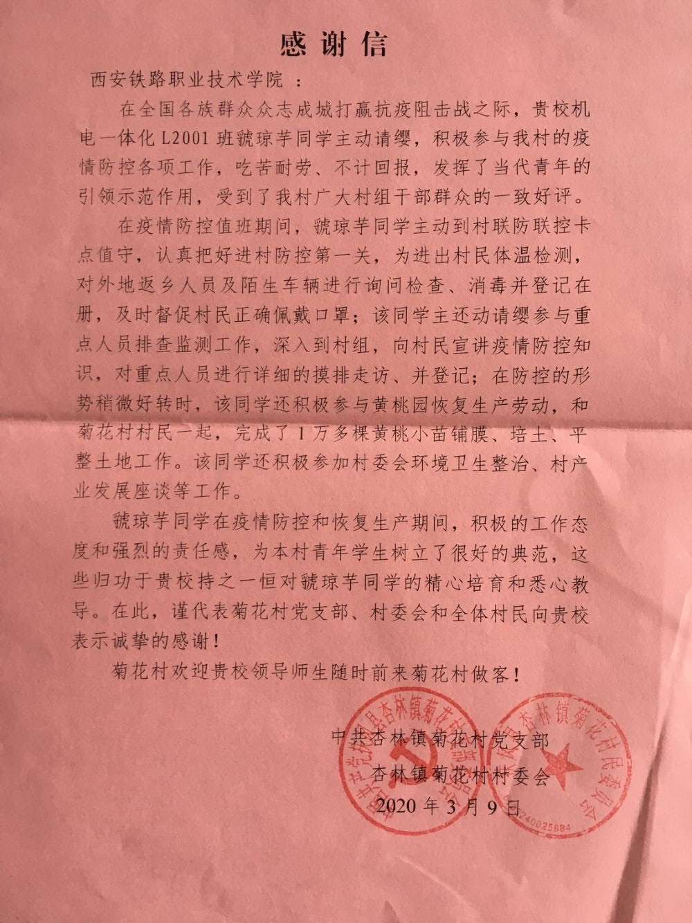 5月初,一封因为疫情滞留些许日子的感谢信送到了机电工程学院,宝鸡市扶风县杏林镇菊花村在感谢信中介绍了必赢官网学生虢琼芋助战家乡抗疫的先进事迹,表扬了该同学敢于作为的精神。