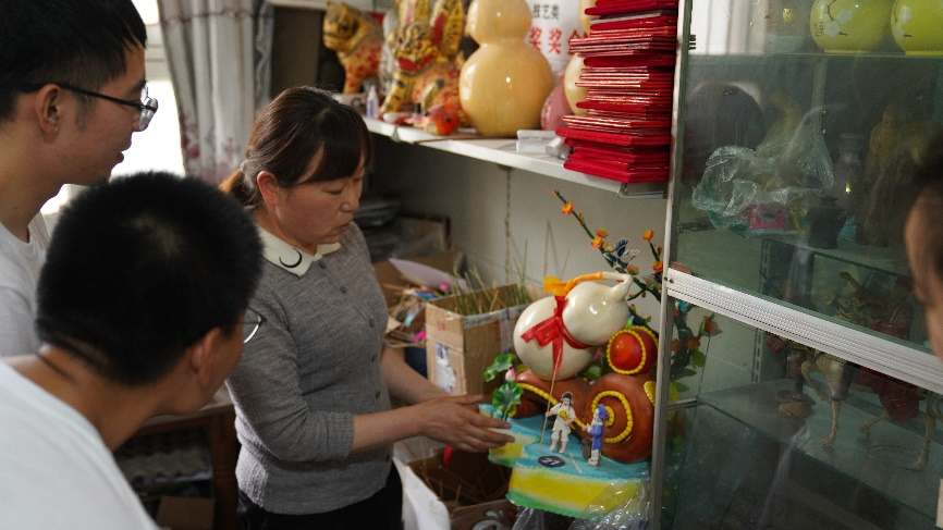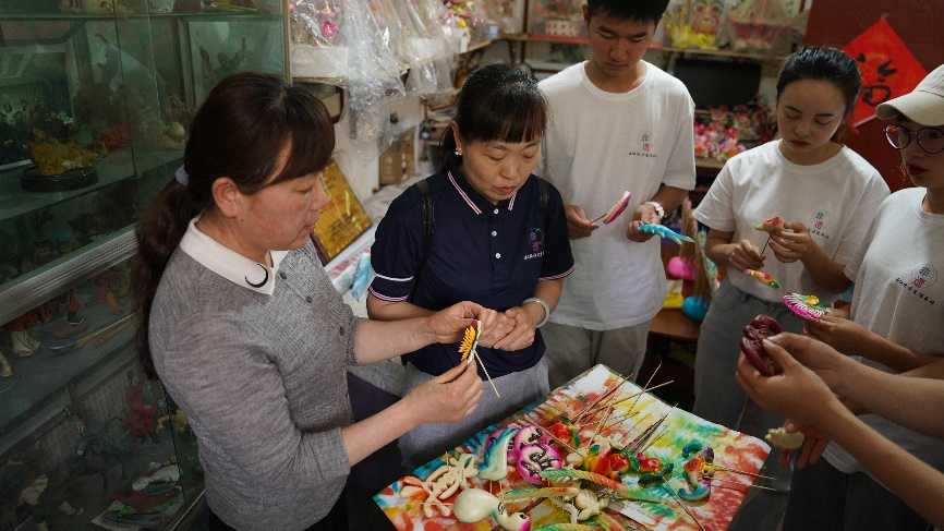 中午11时,非遗传承社的师生们又赶往乾县面花的民间手艺人张美莹工作室,精美且带有浓郁民间艺术色彩的面花惊艳着每一位同学,围着张美莹不停询问产品的制作工艺、民间艺人的生活现状、面花的变现能力、了解当地面花民俗文化、体验面花锦鲤的制作,面花文化的溯源。