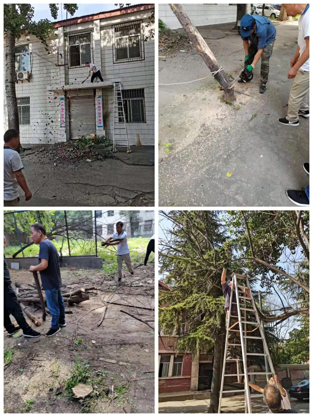 6月29日上午,按照自强综合管理处的总体安排,总务科科长王焕学带领电工、水工、园艺工等近10人到西校区,对自查中发现的5棵中等枯树进行切割,由于空中各种线缆横渡,近有车辆停放,经过集思广益,最后用双绳拉树确保安全且不伤线缆和车辆。他们用电锯截短枝干,相互扶枝拨线,扛起树身,合力将枯树安全落地,一棵树接着一颗树锯。大家不怕苦不怕累,心往一处想,劲往一处使,轮番上阵,经过近3个小时紧张热烈不停歇的努力,最终把锯断的树杆截成一米长的小段,既方便清运,也为学院节约了资金。