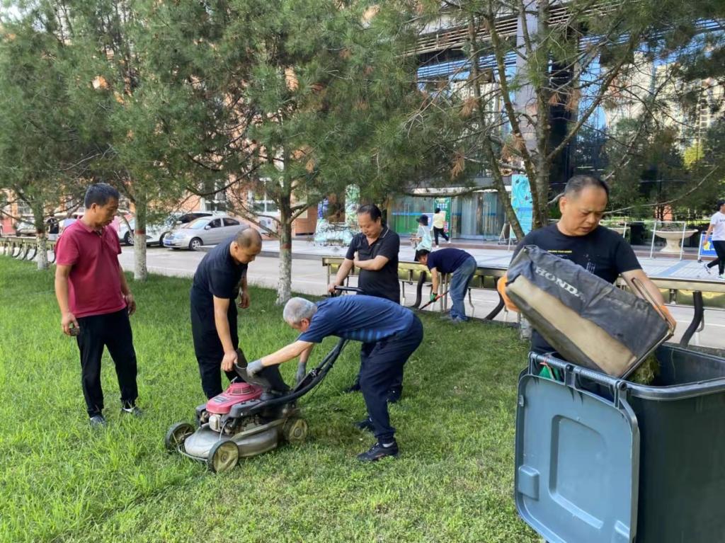 今年雨水较多,校园草坪的草长势旺盛,每隔一段时间就必须修剪。从9月13日开始,总务科水工班、维修班和电工班全部职工在工余,利用休息时间,大家纷纷自觉加入到除草队伍行列中,划分责任区,你追我赶,逐步将校园草坪修剪完成。在修剪工作中,他们争先恐后,带上各类除草工具进入校园绿草坪,冒着秋老虎的余威,挥洒汗水,各展绝技,,艳阳下他们撸起袖子加油干,无畏炎炎烈日,精心将除草工作做到极致。有的推割草机进行杂草清除,有的将车里的杂草倒进垃圾桶,有的用垃圾桶将杂草清运至垃圾台,有的用剪刀剪枯树枝,他们分工明确,配合默契,草坪迅速变得平整,割草机的使用也越用越熟练。