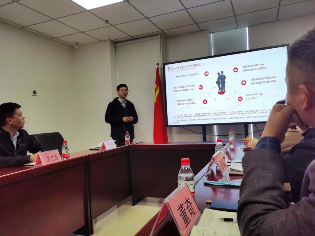 11月12日下午,在电子信息学院党总支书记张伟敏、院长董奇的带领下,通信技术教研室主任赵娟、杨国荣、高兰、邹娜等教师赴公诚管理咨询有限公司第八分公司陕西分公司进行企业访谈,得到陕西分公司总经理邵宏平、副总经理李广斌、第八分公司第一党支部书记潘文晓、第八公司集客部副经理文星的热情接待,座谈会由公司项目管理室主任杨松涛主持。