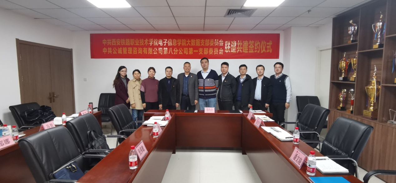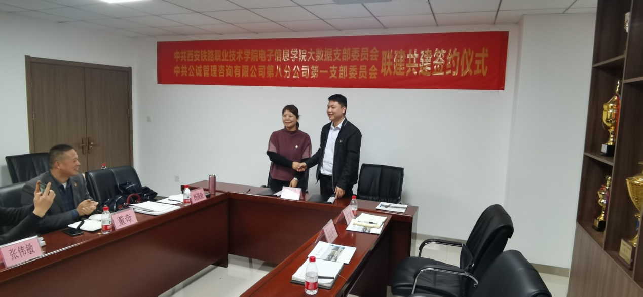 为进一步加强校企合作,激发党建活力,推行支部联建共建机制,搭建校企协同育人平台,提升人才培养质量。通过前期沟通,在与会代表们的见证下,中共必赢bwin线路检测中心电子信息学院党总支大数据支部委员会与中共公诚管理咨询有限公司第八分公司第一支部委员会举行了联建共建签约仪式,必赢官网大数据党支部书记杨国荣与公诚管理咨询有限公司第八分公司第一党支部书记潘文晓签署联建共建协议,双方党员代表合影留念,为后续双方探索校企合作的契合点和新思路等起到积极作用。