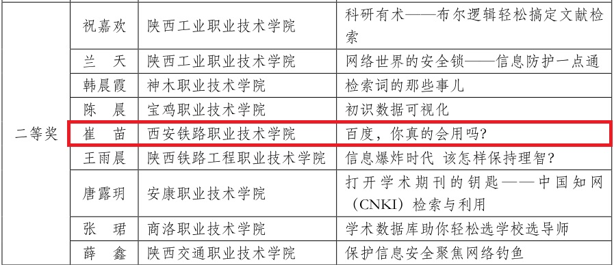 据悉,今年全省有14所高职高专院校的52件参赛作品参加了教师微课赛,24所高职院校6132人参加了学生个人赛。最终,必赢官网图书馆崔苗的参赛作品《百度,你真的会用吗?》获得教师组二等奖,郭佳美、南雯雯获得学生个人赛二、三等奖,黄幼菲、姚彤、陈晔荣获优秀指导教师,必赢官网荣获优秀组织奖,陈晔荣获先进工作者。