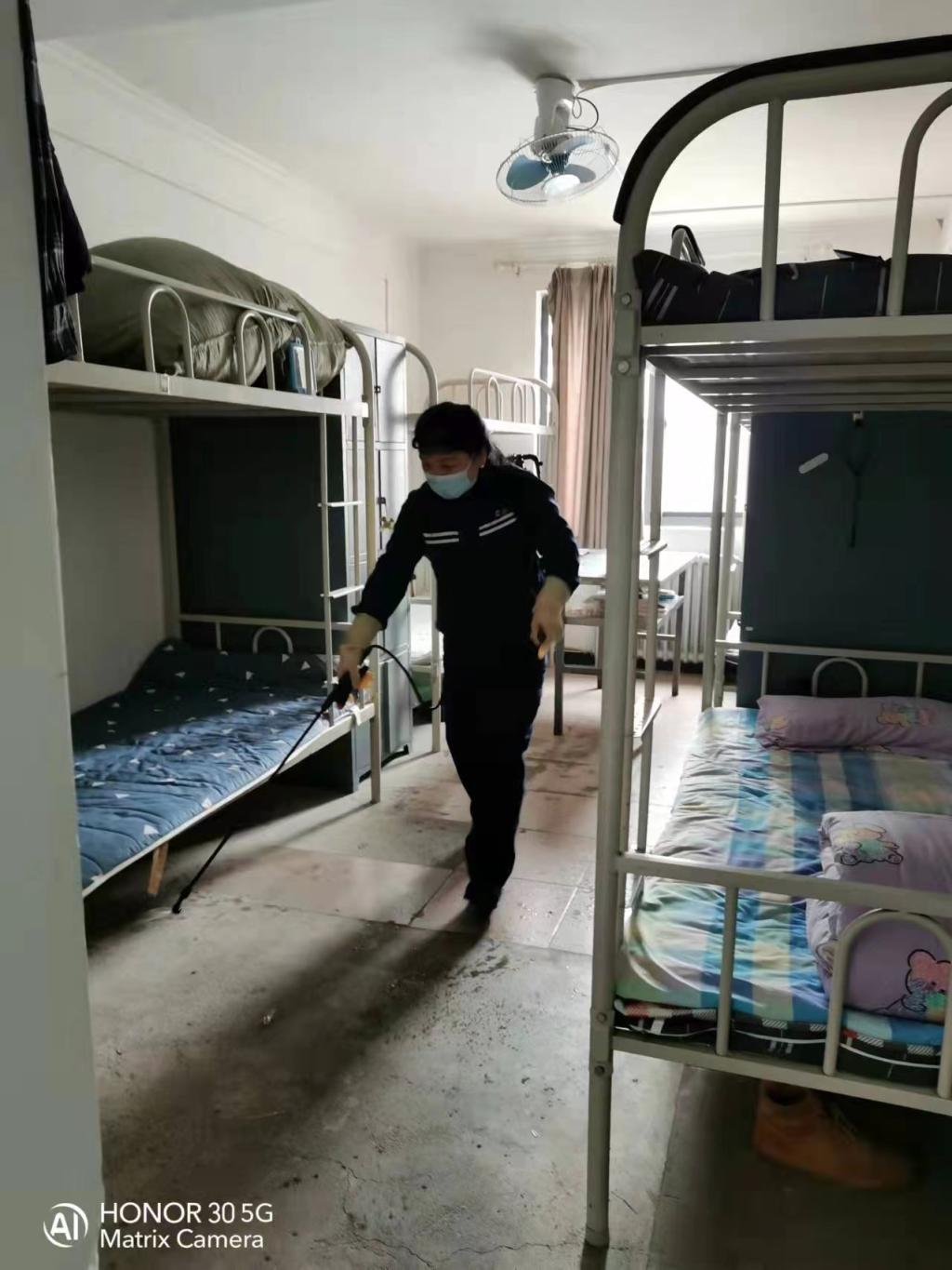 此外,结合近期常态化疫情防控工作实际及春季呼吸道传染病多发的情况,校区对公寓进行了一轮整体消杀。3月30日上午,校区62间学生公寓在人员清场的前提下,由专业消杀人员对公寓内部实行 “8·4” 配比消毒液整体消杀,并确保消杀后关闭门窗半小时,再打开门窗通风半小时。