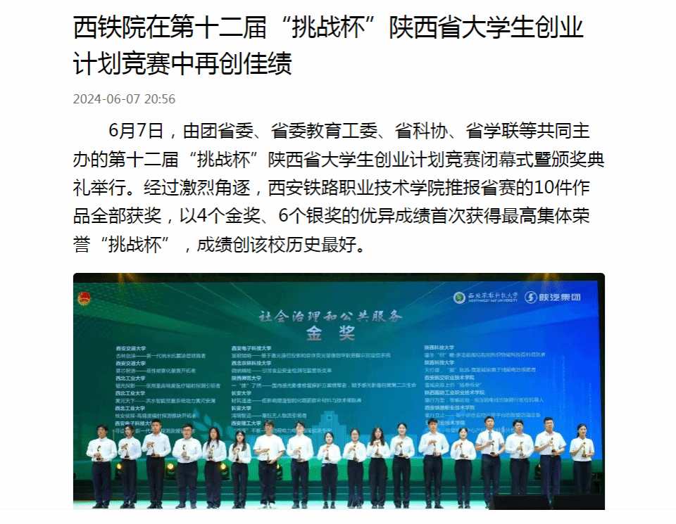 西铁院在第十二届“挑战杯”陕西省大学生创业计划竞赛中再创佳绩