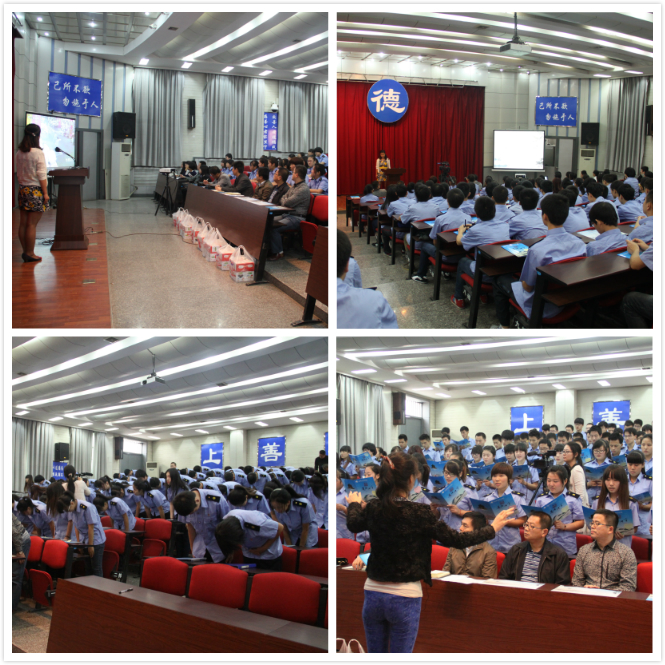本次道德讲堂的主题为“关爱他人,感恩社会”。在焦雯老师的主持下,讲堂围绕“道德思考”、“省心”、“行崇德礼”、“唱道德歌曲”、“讲道德故事”、“诵道德经典”、“做道德承诺”、“送尚德祝福”八个环节展开,内容丰富,发人深省。师生对“小悦悦事件”MV进行道德思考与自我反省;全体学生起立行崇德礼并齐唱歌曲《好人就在身边》; 2012级两位学生陈璐和李飞讲述他们与家境贫困并身患重型再生障碍性贫血的汉中小姑娘吕茜的爱心故事;主持人带领大家一起诵读和学习了《大学》中的“物格而后知至,知至而后意诚,意诚而后心正,心正而后身修,身修而后家齐,家齐而后国治,国治而后天下平。”一段话并进行解读;学生们写下自己的道德承诺贴在道德承诺栏上;活动以老师为同学们送上了印有中外道德格言的小礼物,表达祝愿而告结束。