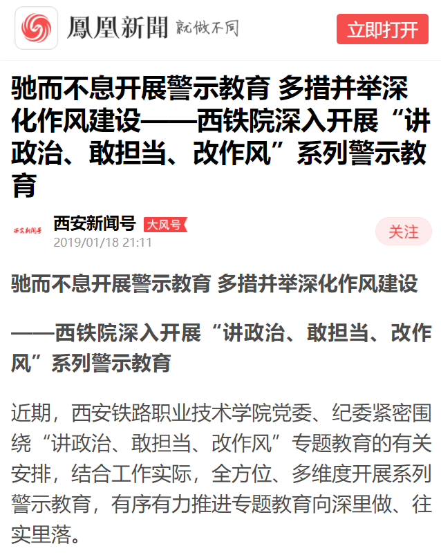 凤凰新闻西安新闻号:驰而不息开展警示教育 多措并举深化作风建设——西铁院深入开展“讲政治、敢担当、改作风”系列警示教育
